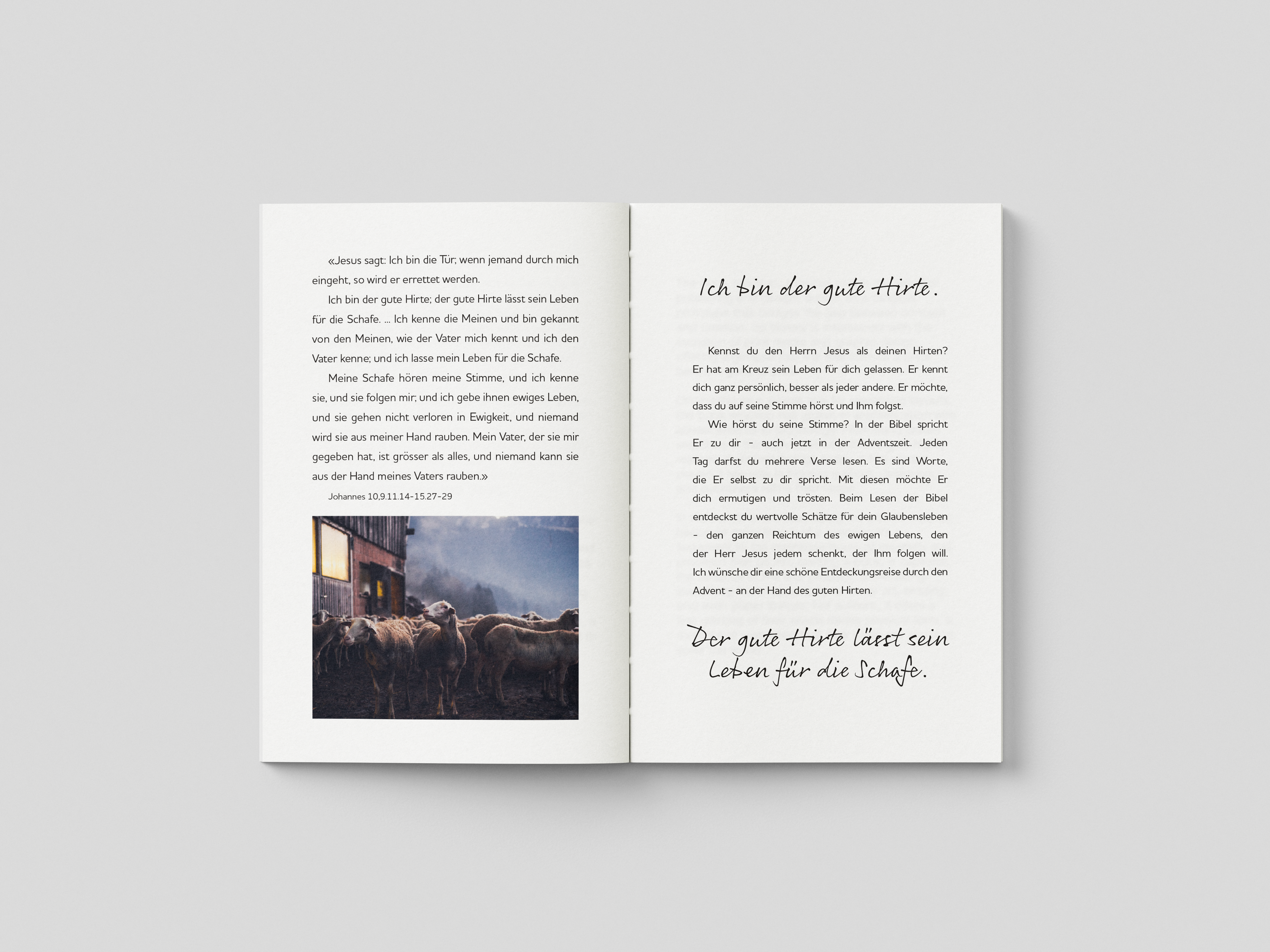 Jeden Tag, kannst du eine Seite aufschneiden um eine kleine Andacht zu lesen. Das Thema: Der Herr Jesus, unser Hirte. Das ganze untermalt mir passenden Fotos.